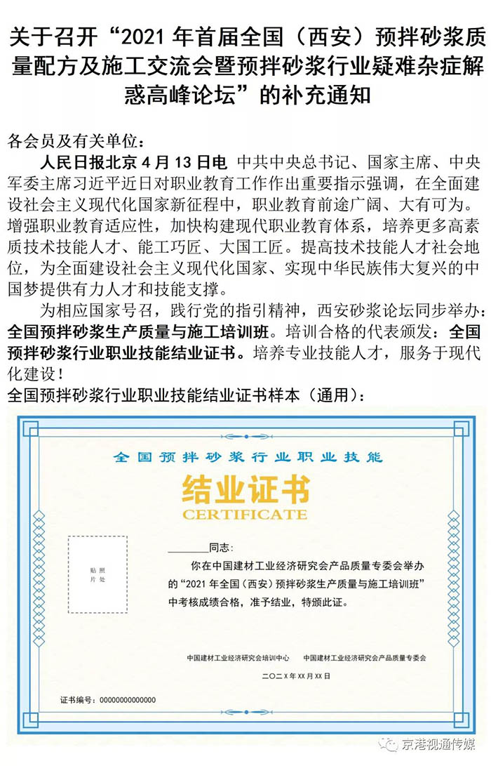 關于舉辦“2021年首屆全國(西安)預拌砂漿質量配方及施工交流會暨預拌砂漿行業(yè)疑難雜癥解惑高峰論壇”的通知
